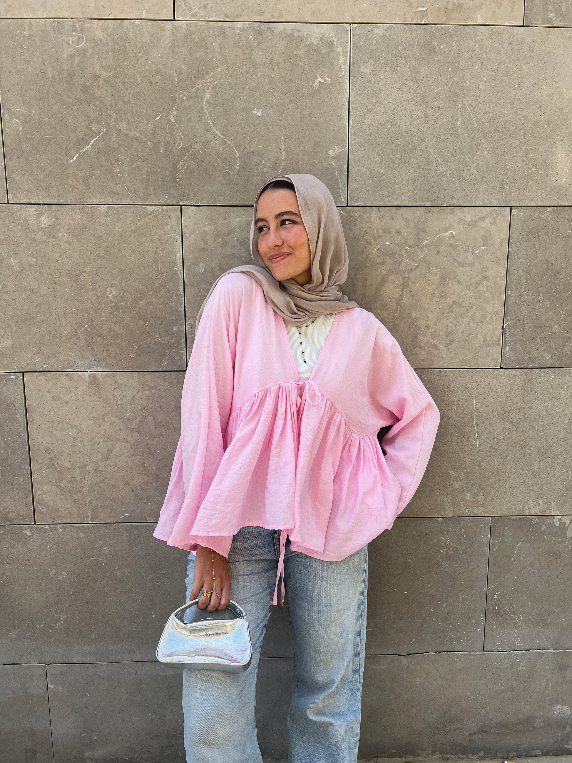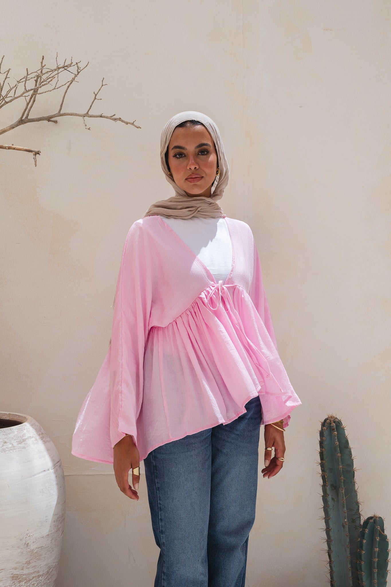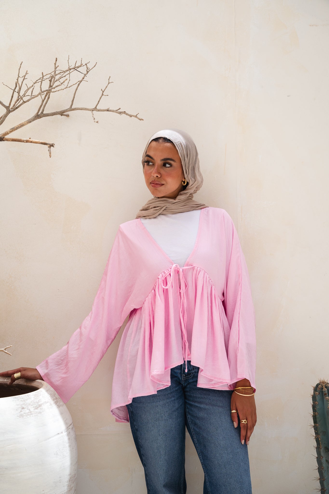This flowy day dreamer blouse features a soft, lightweight fabric with a relaxed fit. It has a V-neckline with a small tie detail and gentle gathers that create a layered look. The long sleeves add comfort and elegance, making it perfect for everyday wear or casual outings.