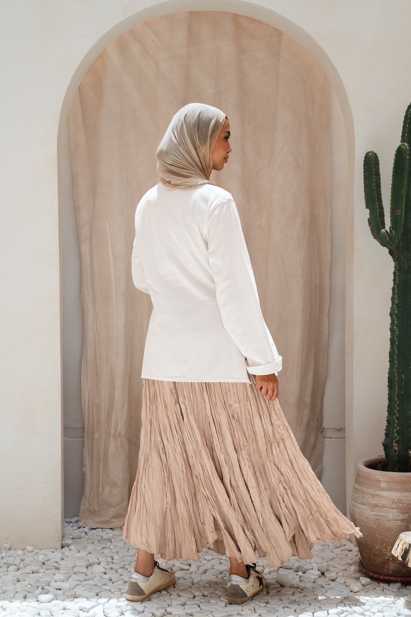 This expertly crafted Dove Crushed Asymmetrical Skirt combines modest elegance with contemporary style. The distinctive crushed fabric creates visual texture while maintaining a lightweight feel perfect for summer wear. Its asymmetrical design adds a sophisticated touch to the flowing silhouette, ensuring graceful movement with every step. Ideal for the fashion-forward woman seeking both modesty and feminine flair in warm weather.