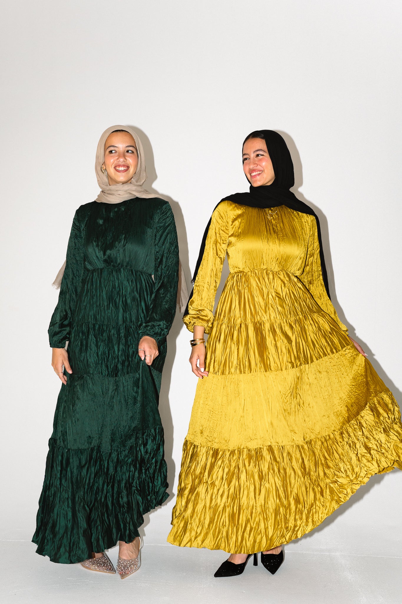 Golden tiered maxi dress with a soft crinkle finish and golden layers, designed to move beautifully.