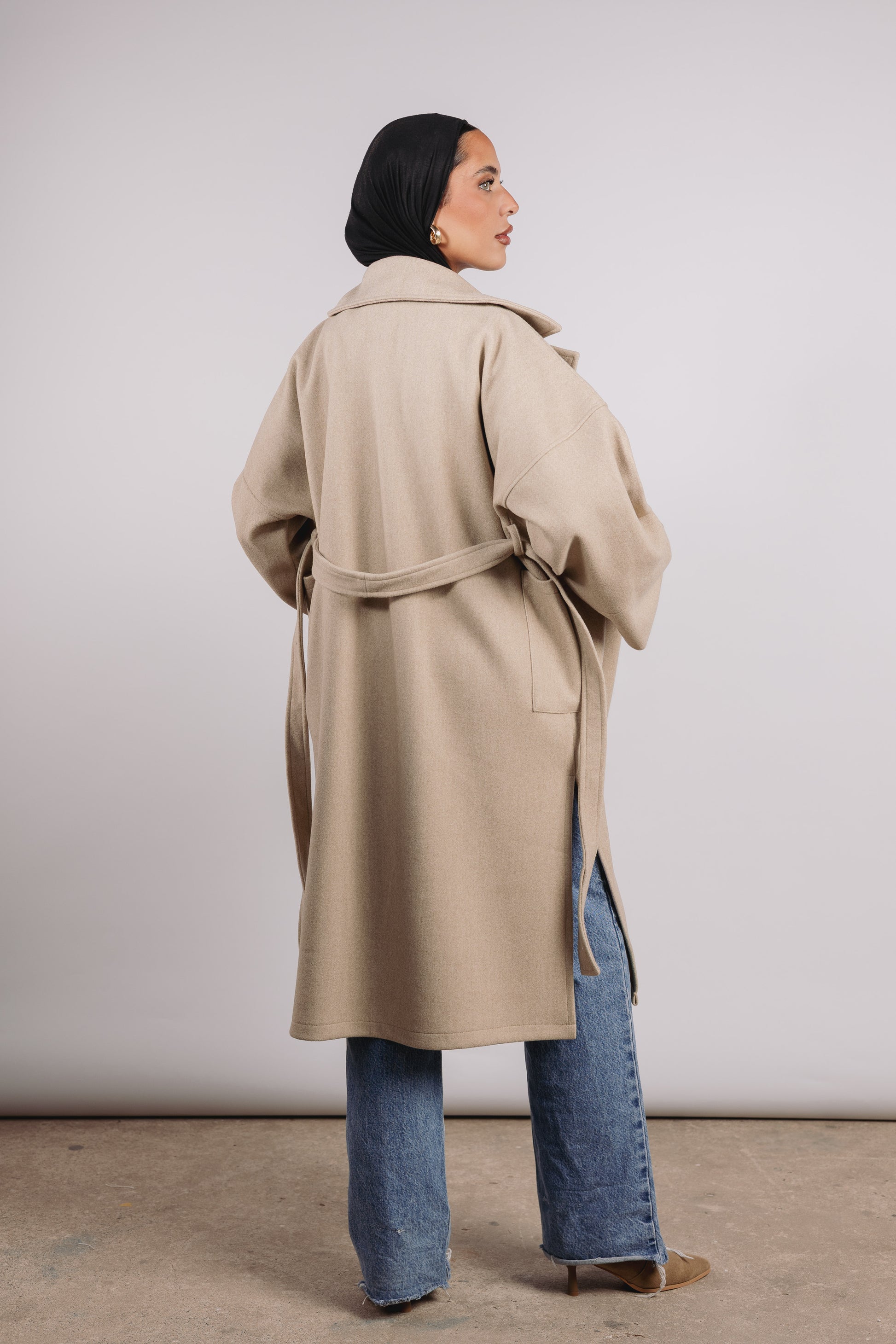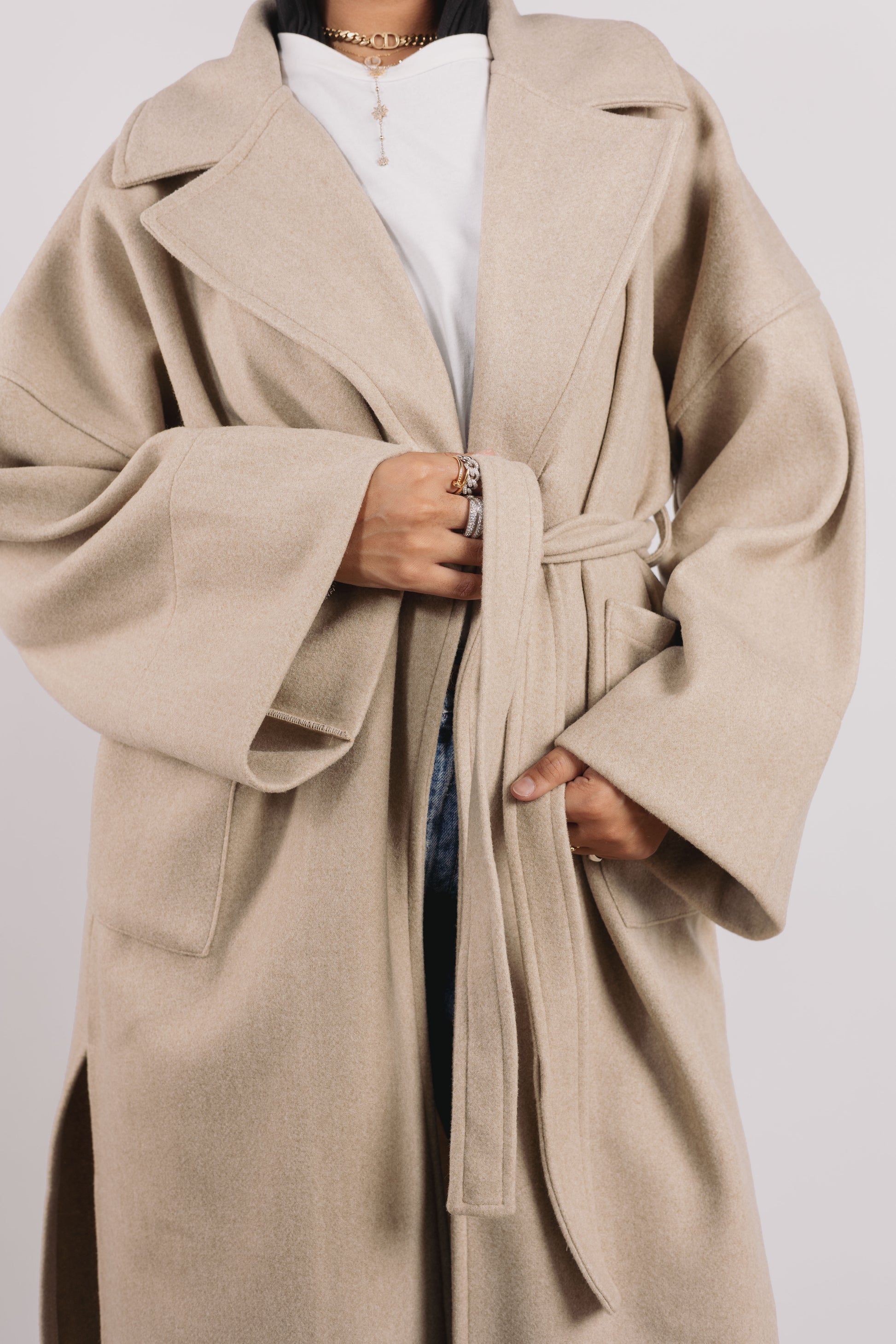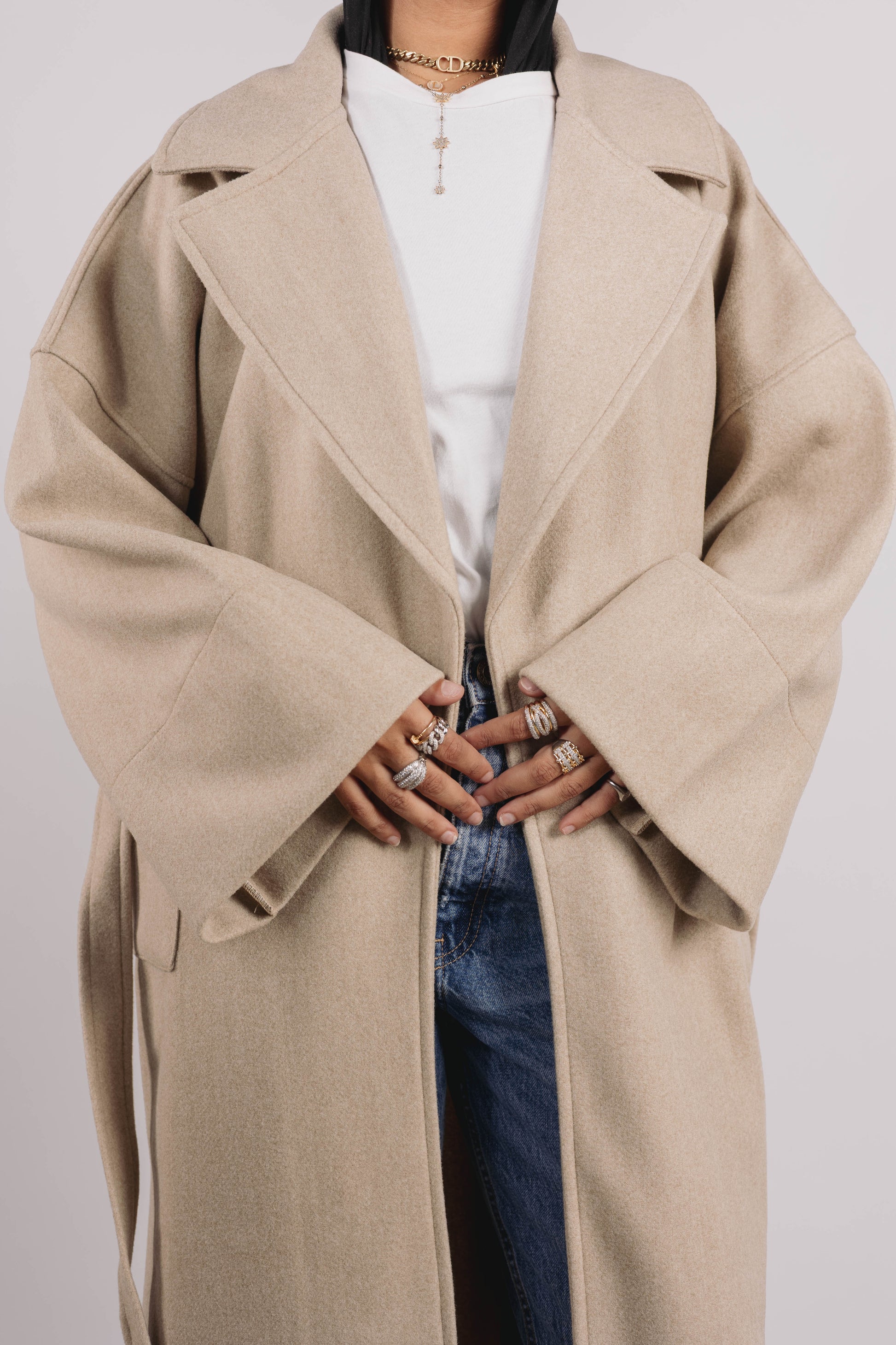 Stay stylish and warm this season with our Beige coat! Made from soft fabric, it features a flattering fit and the classic lapel collar , a belt for closure give it a timeless look, while side pockets add convenience
