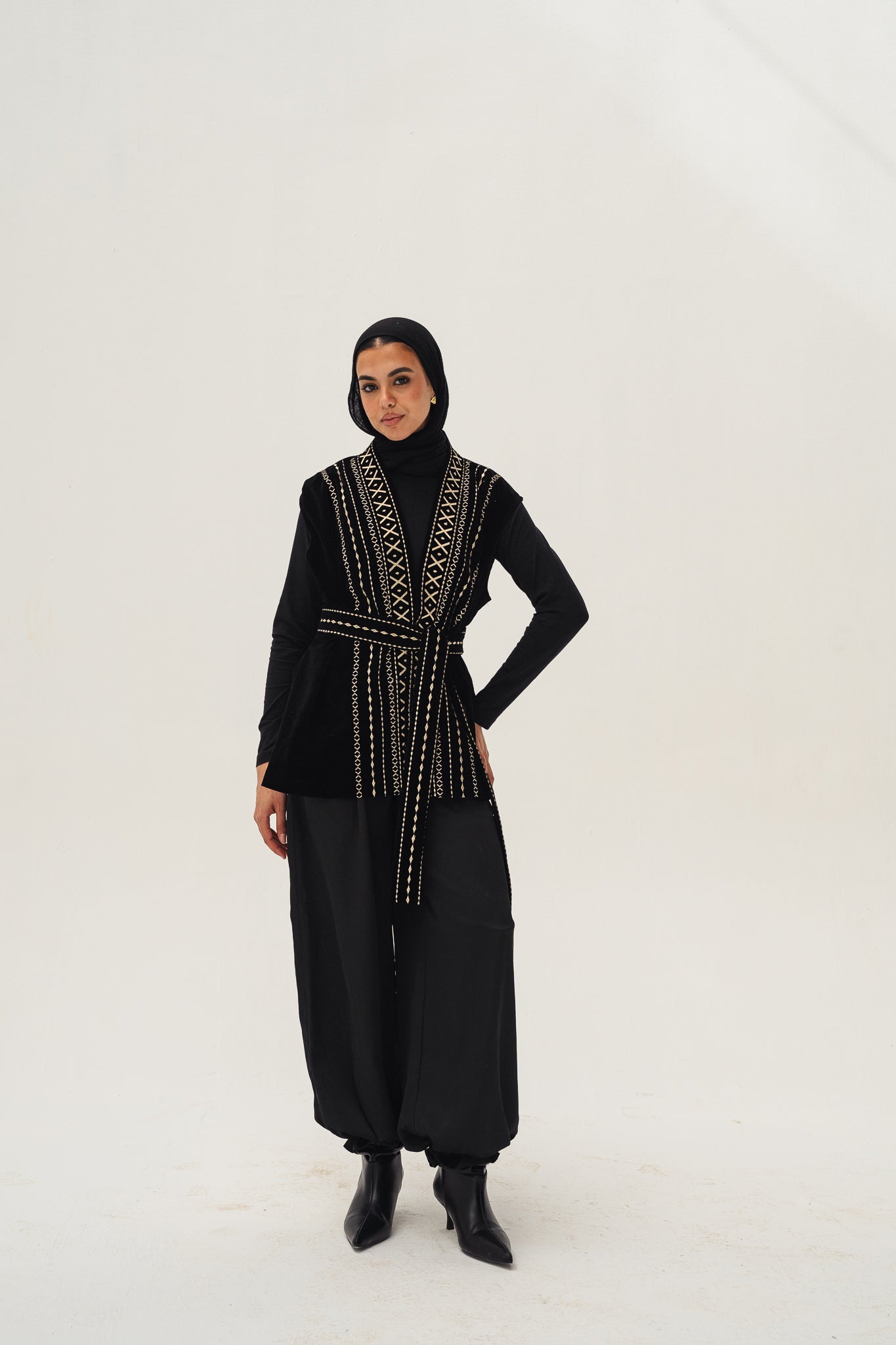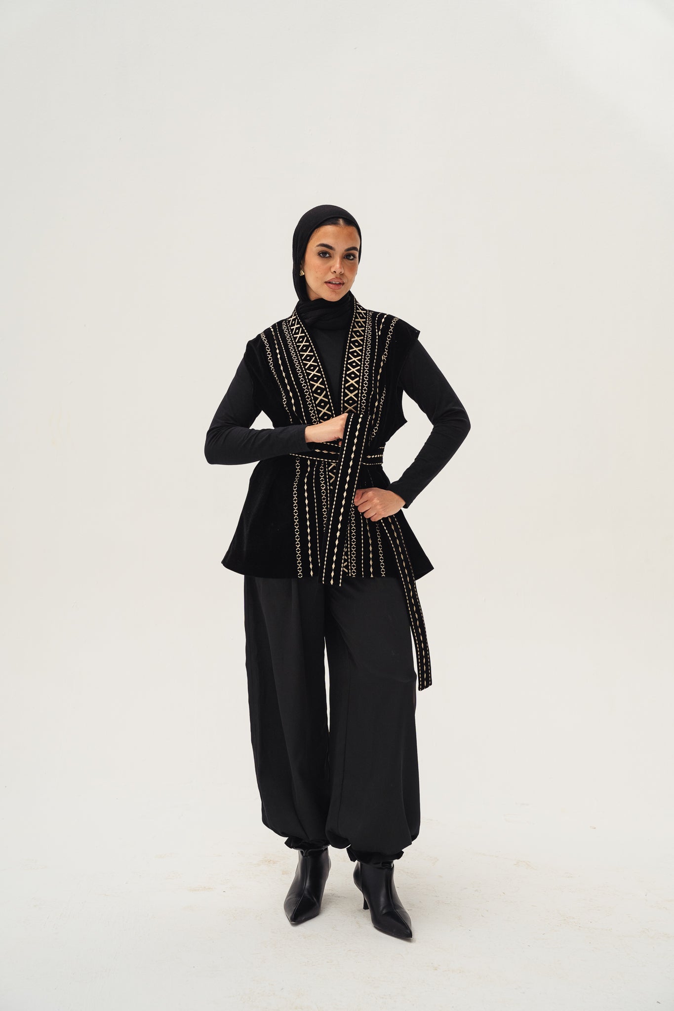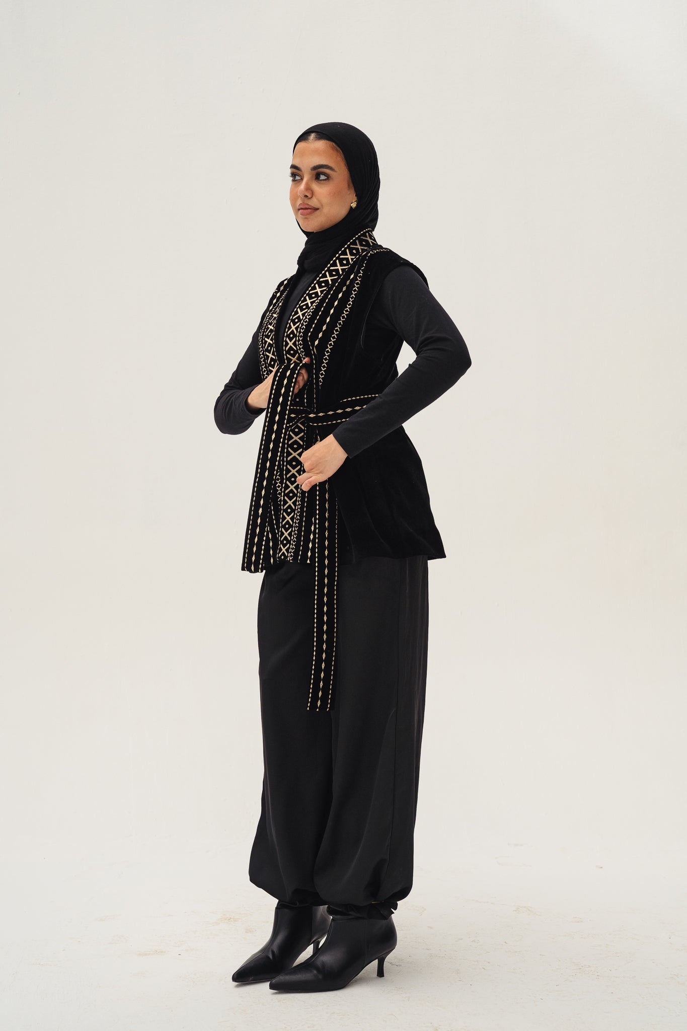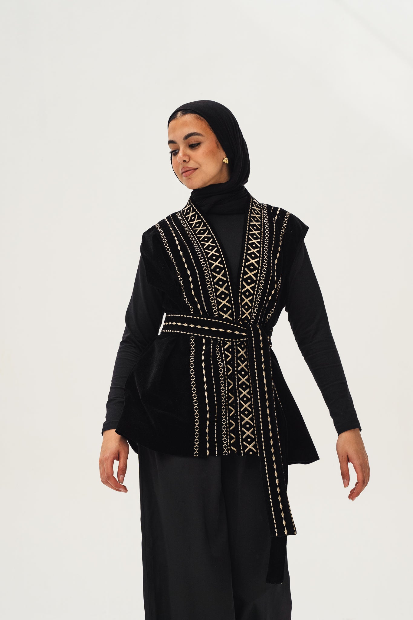 This black embroidered velvet vest is a wardrobe statement, crafted from high-quality velvet for a luxurious feel . Featuring gold intricate embroidery for a refined touch, it comes with a detachable belt to create styling options, allowing you to switch from structured to relaxed looks effortlessly.