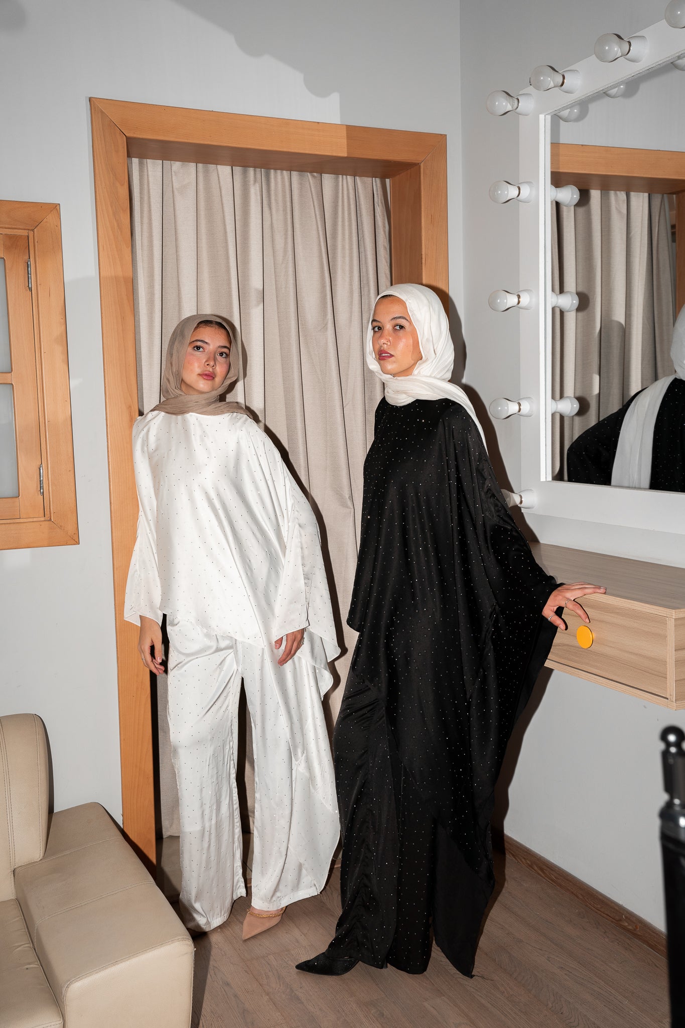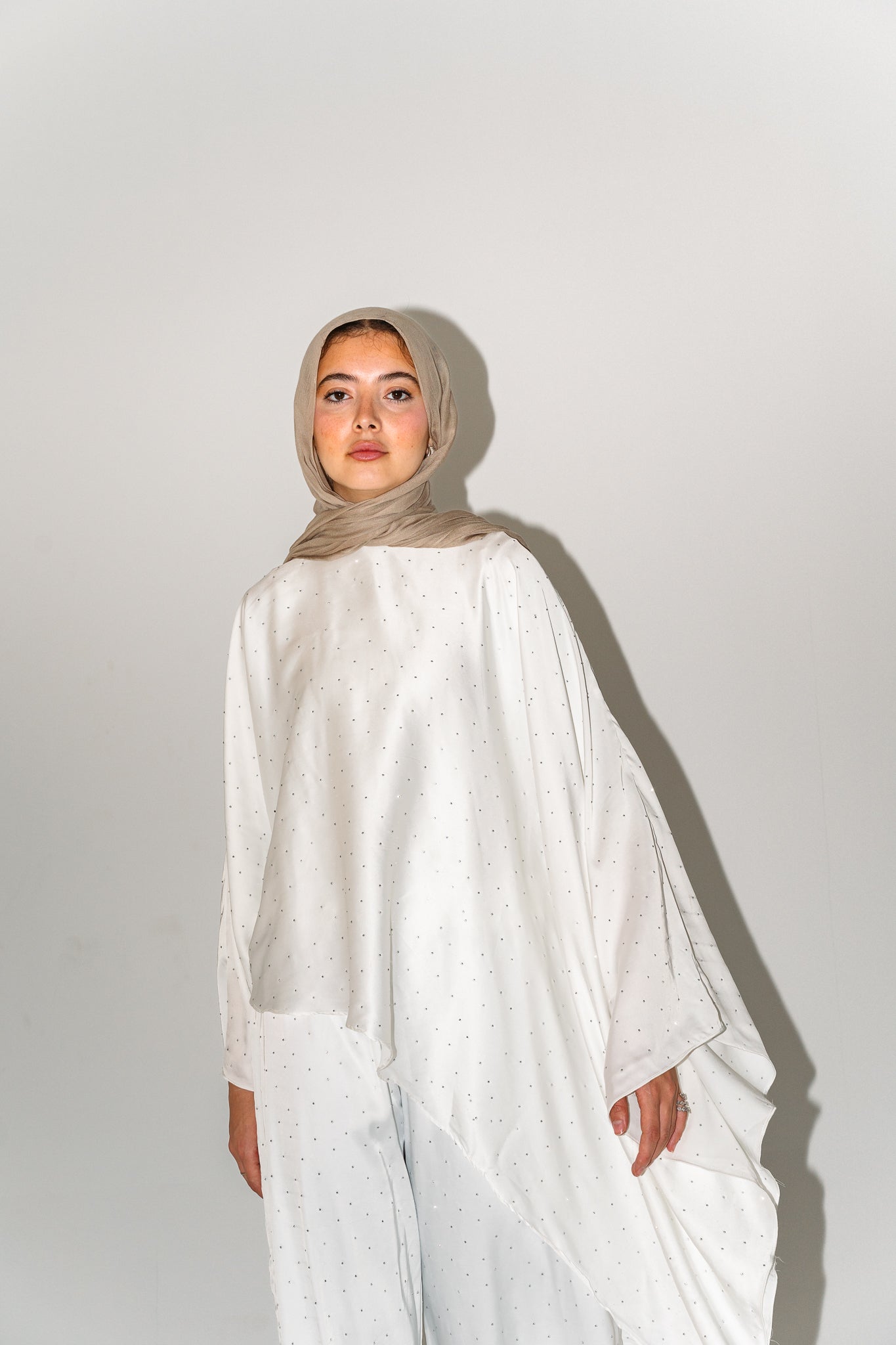 Unleash your inner star with our stunning white satin bedazzled set. Luxuriously soft and exquisitely detailed, this set shimmers with every move, ensuring all eyes are on you! Perfect for a glamorous night out or a sophisticated evening in, it's designed to make you feel as radiant as you look!